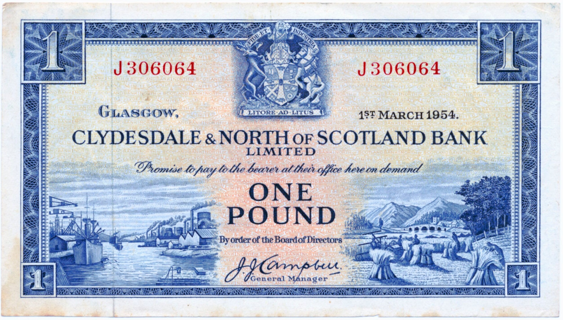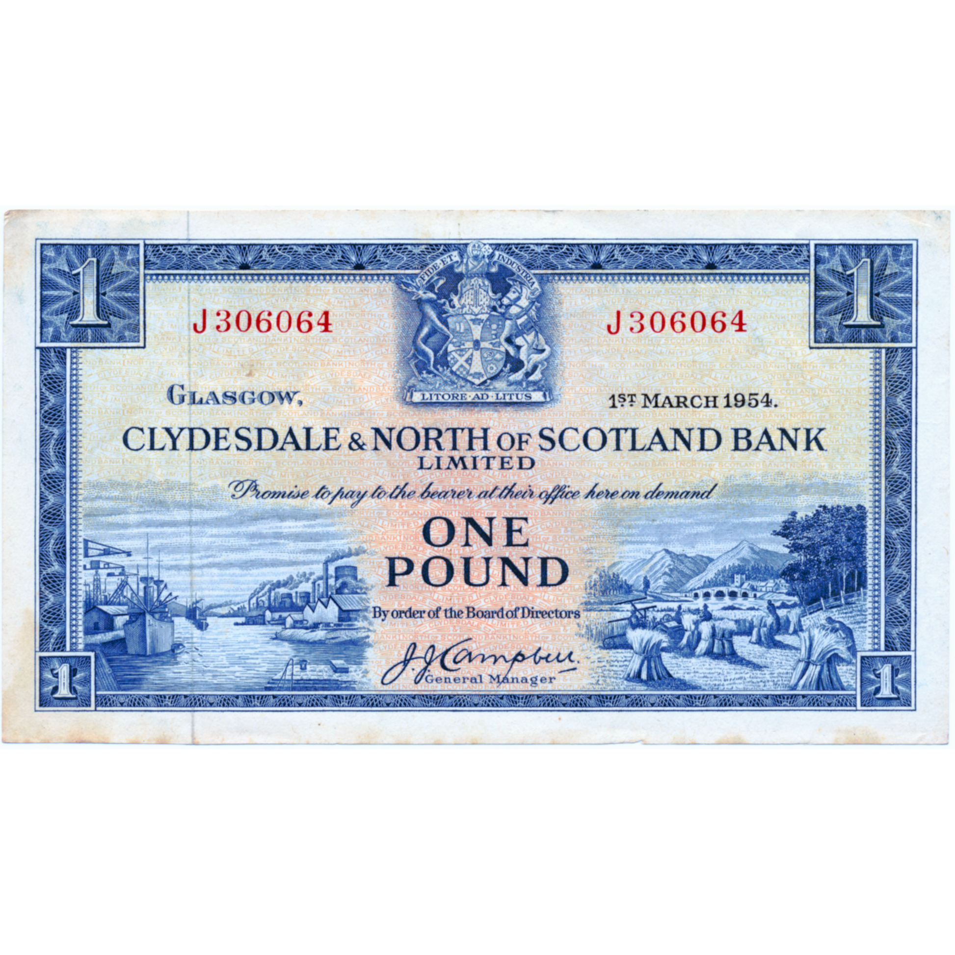 SCOTLAND P.191a SC311a 1954 Clydesdale & North of Scotland Bank £1 GVF J