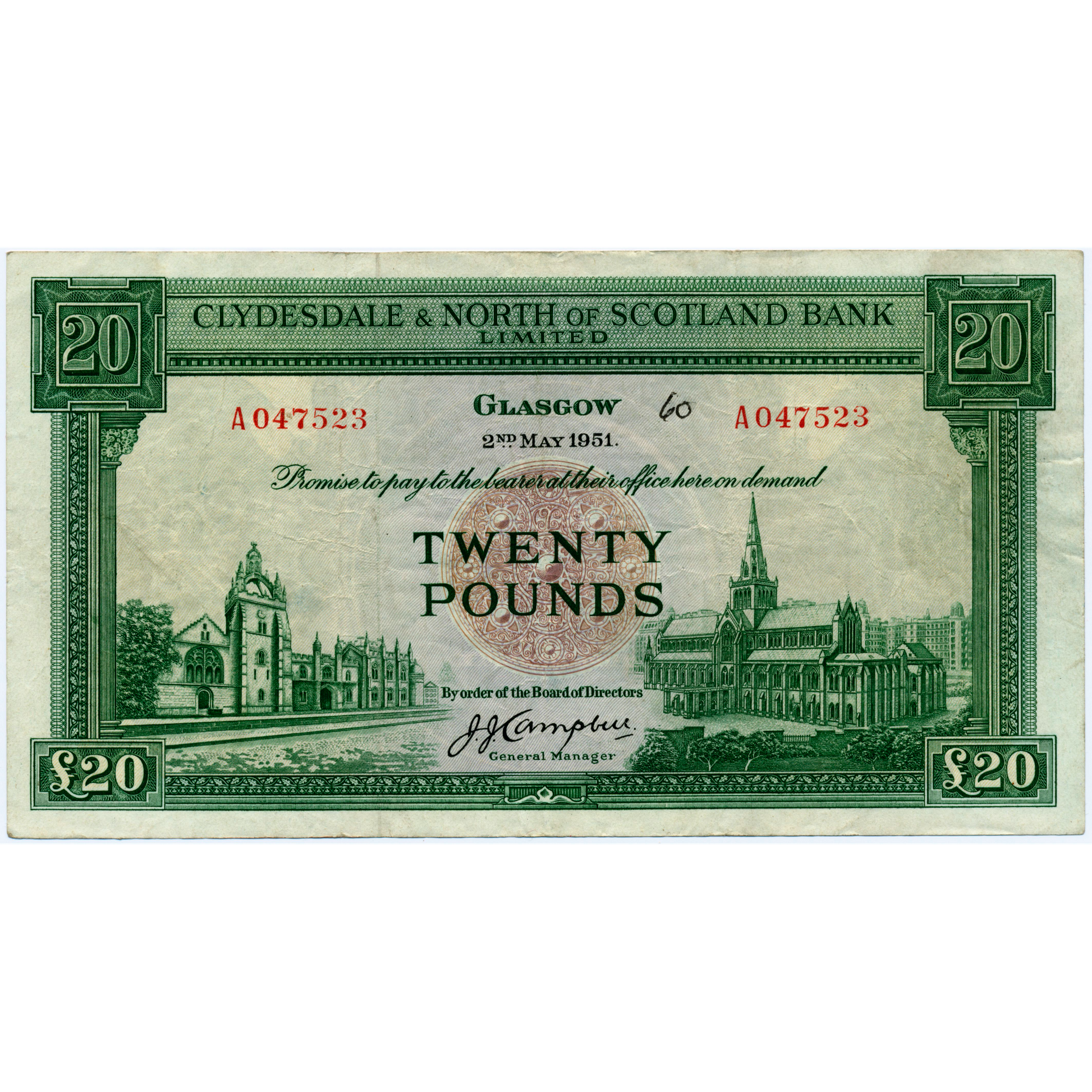 SCOTLAND P.193a SC315a 1951 Clydesdale & North of Scotland Bank £20 VF A
