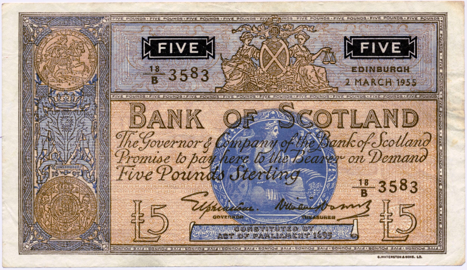 SCOTLAND P.99a SC116a 1955 Bank of Scotland £5 VF 18/B