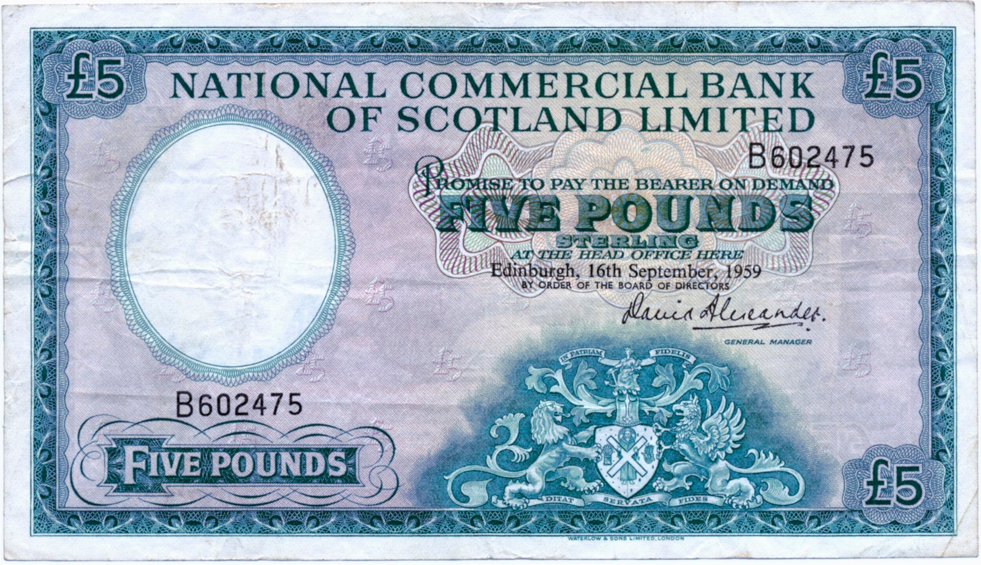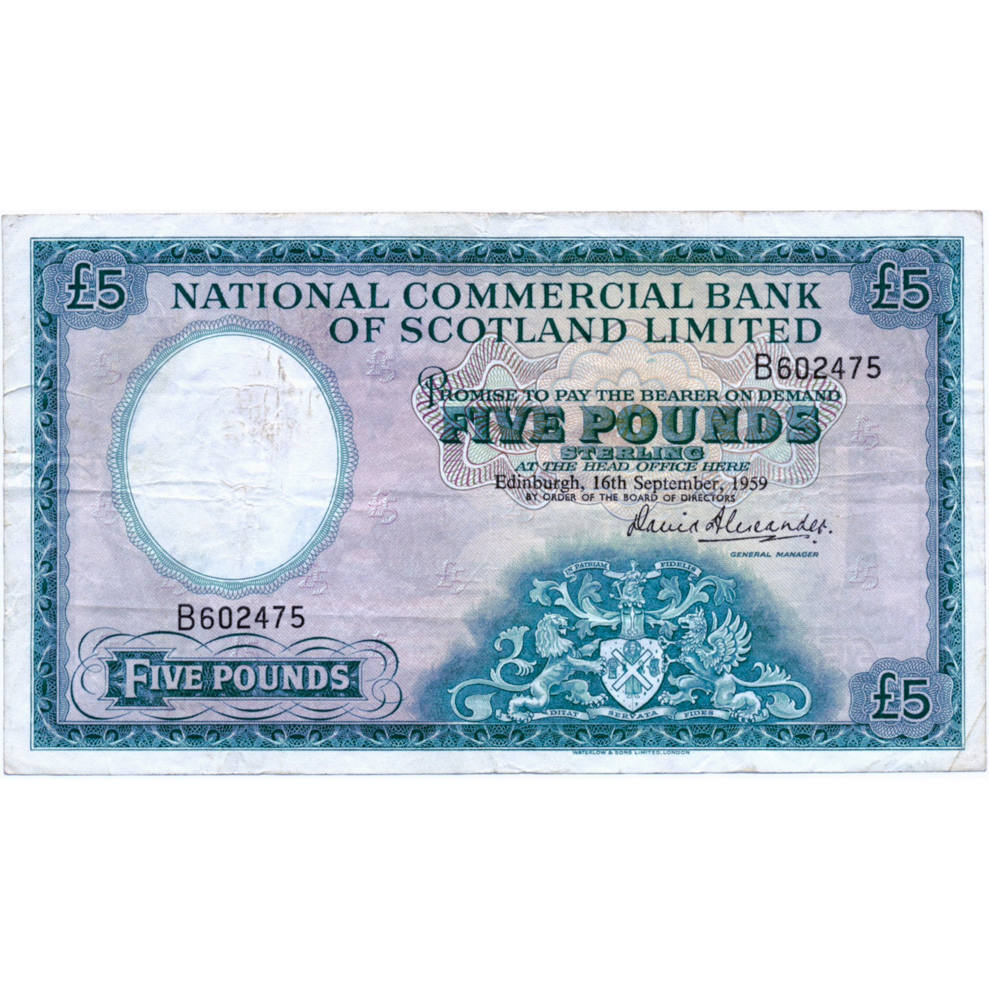 SCOTLAND P.266 SC611 1959 National Commercial Bank of Scotland £5 VF B
