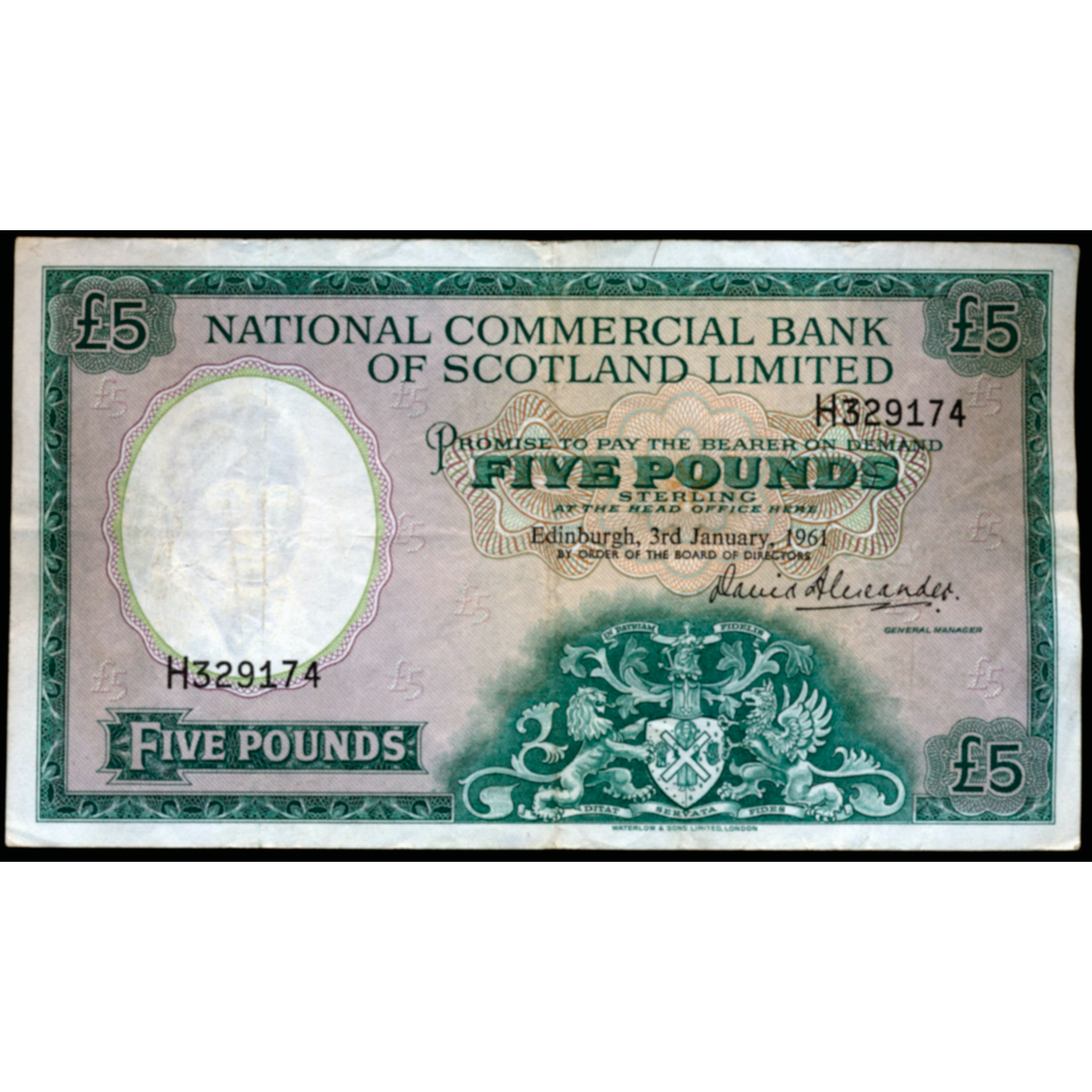 SCOTLAND P.270 SC612 1961 National Commercial Bank of Scotland £5 VF H