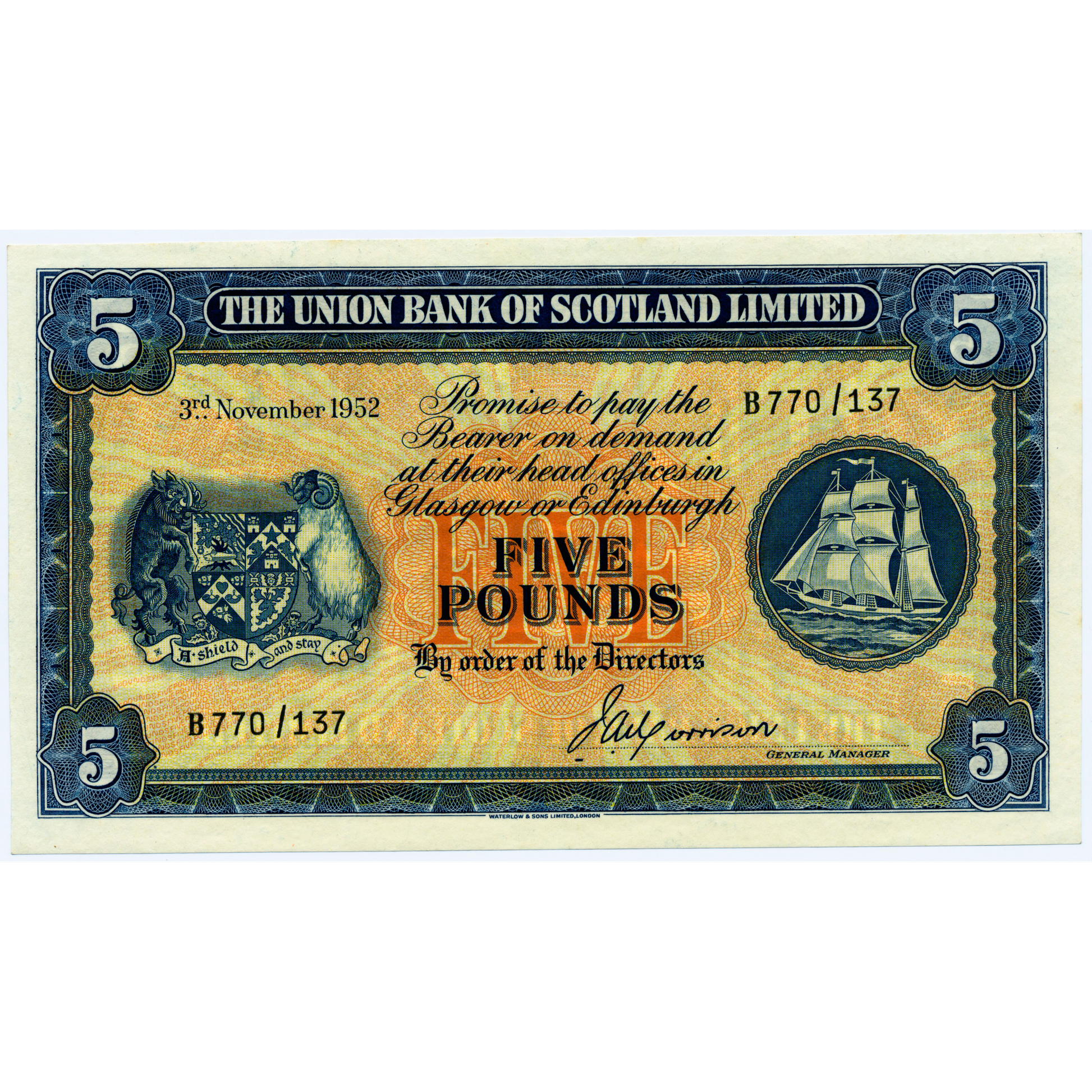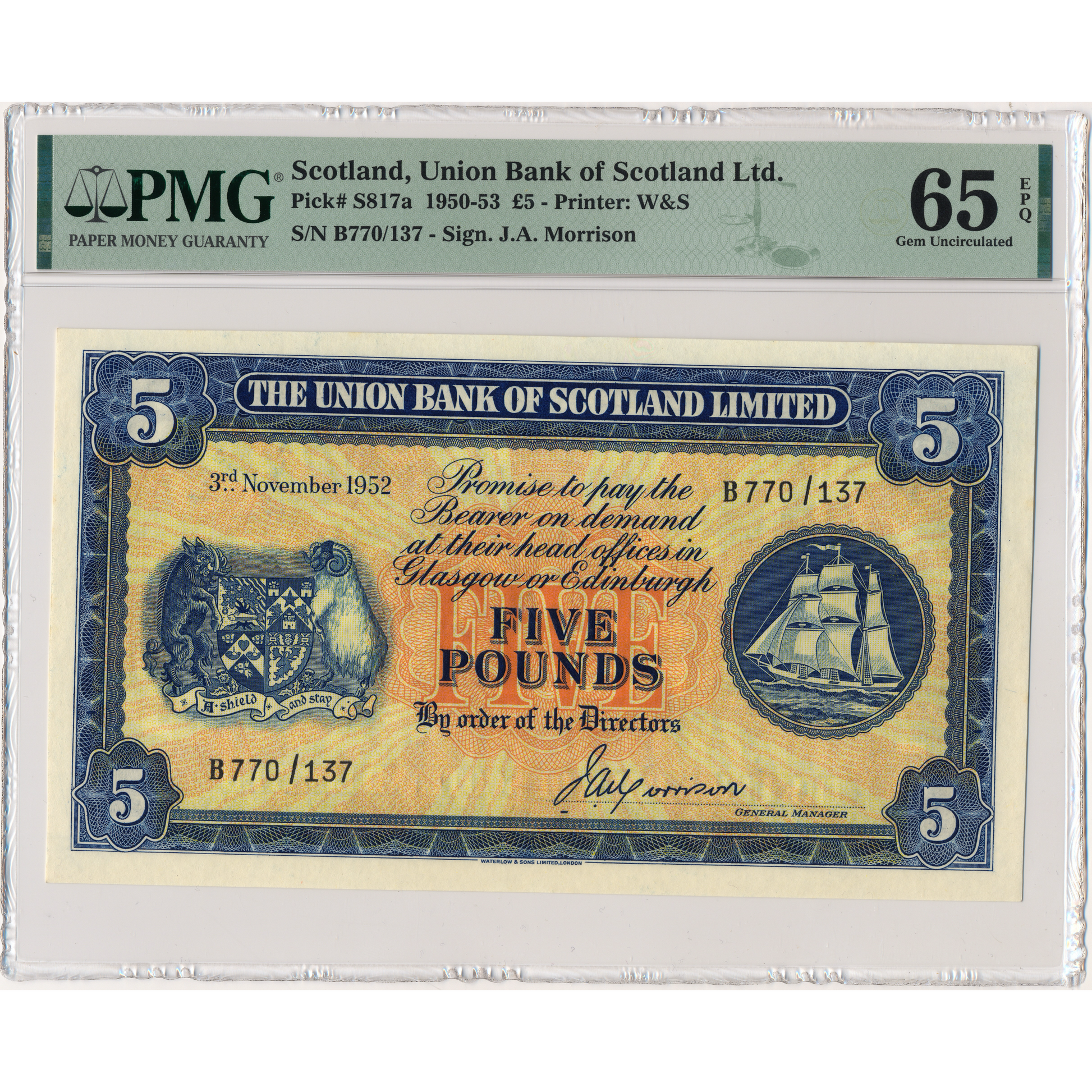 SCOTLAND P.S817a SC913a 1952 Union Bank of Scotland £5 Gem UNC 65 EPQ