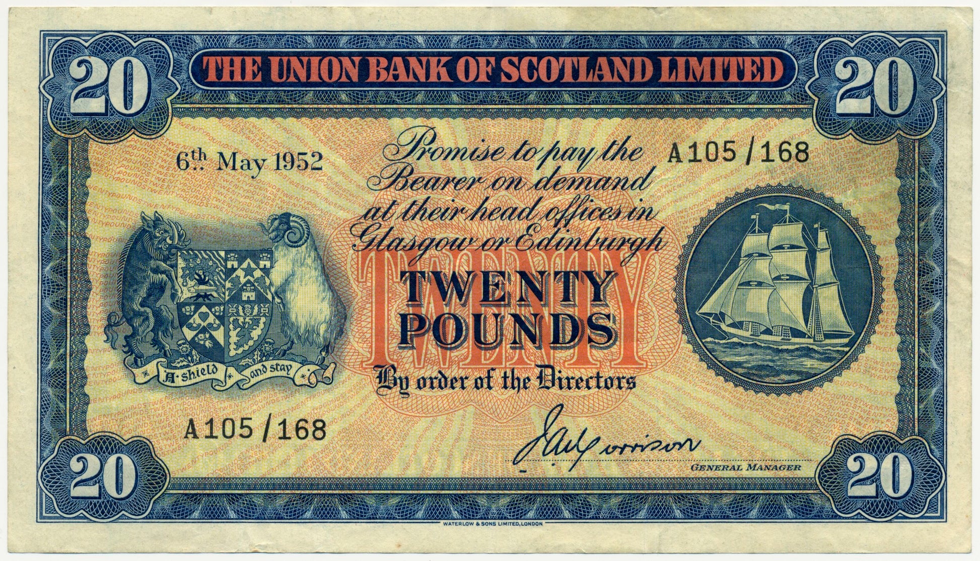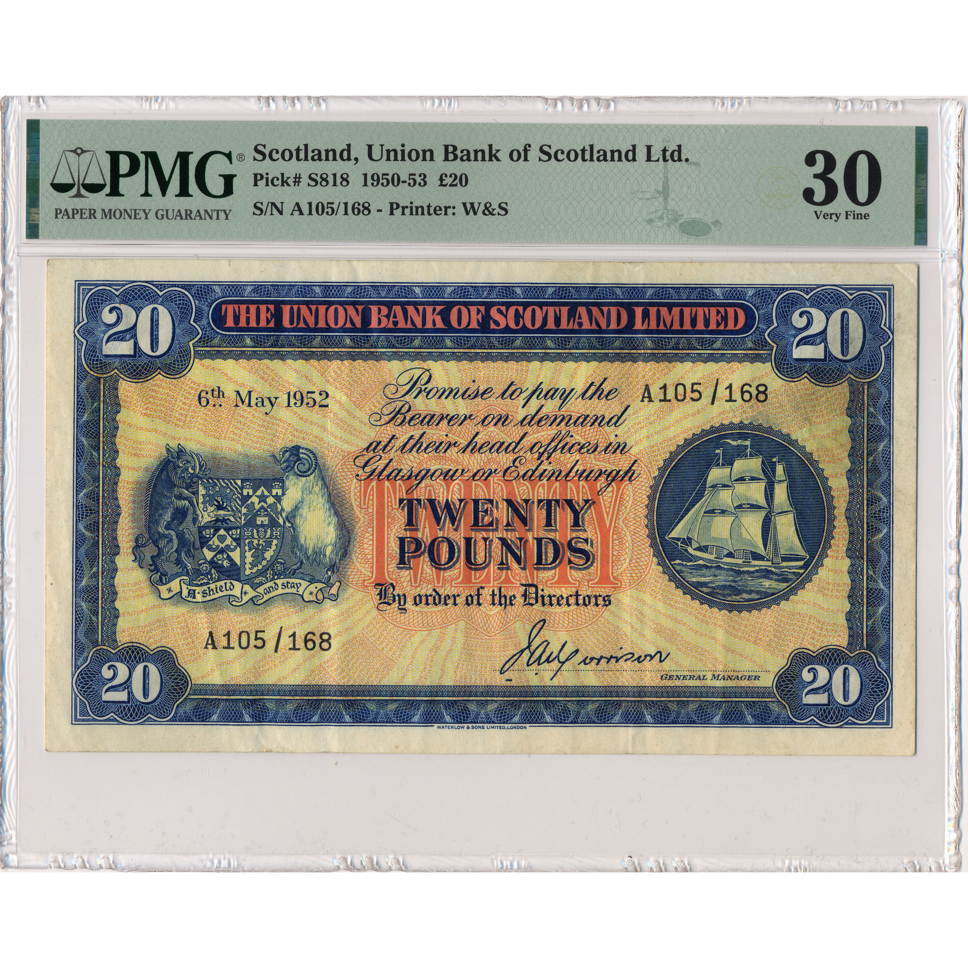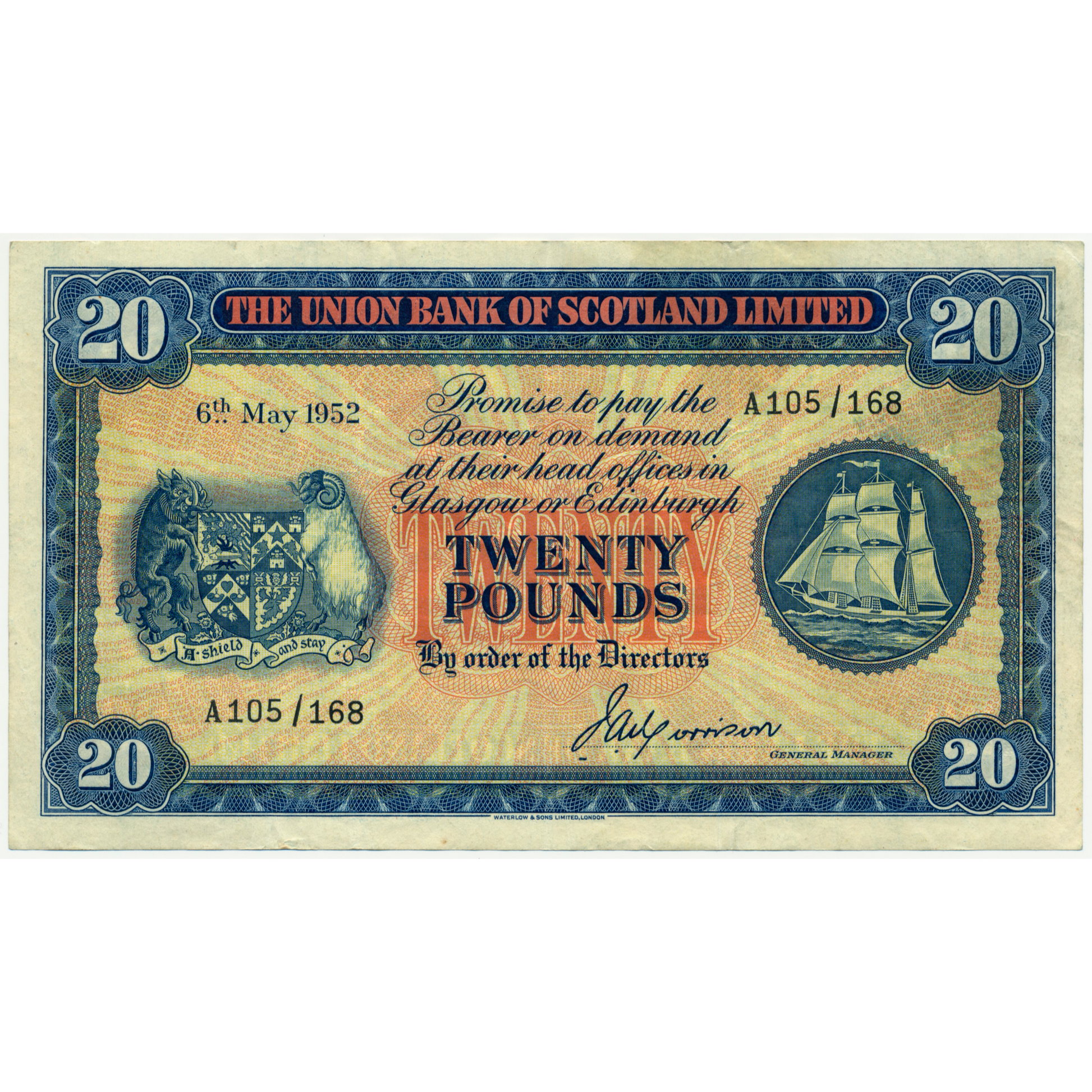 SCOTLAND P.S818 SC933 1952 Union Bank of Scotland £20 VF 30