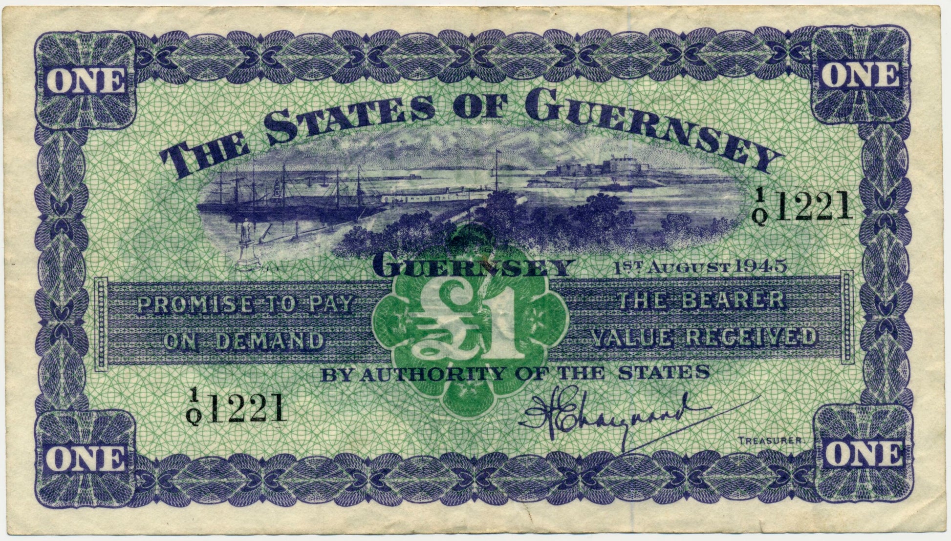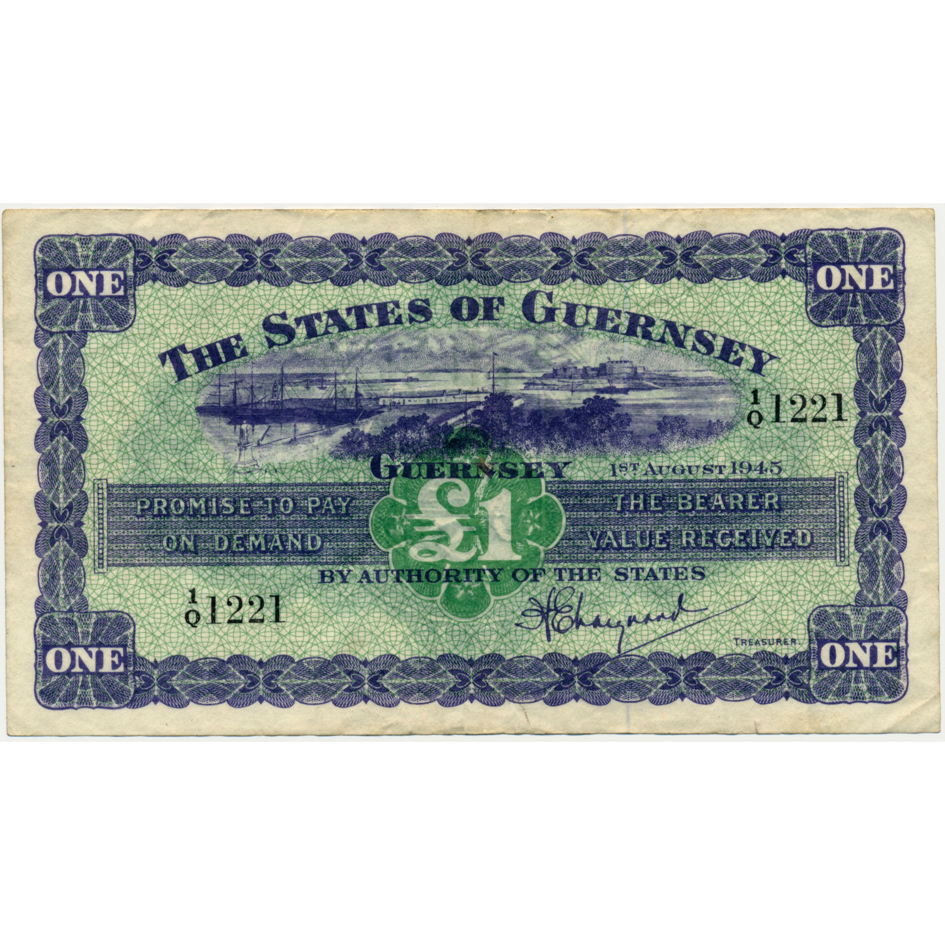 GUERNSEY P.43a GU33a 1945 £1 GVF 1/Q