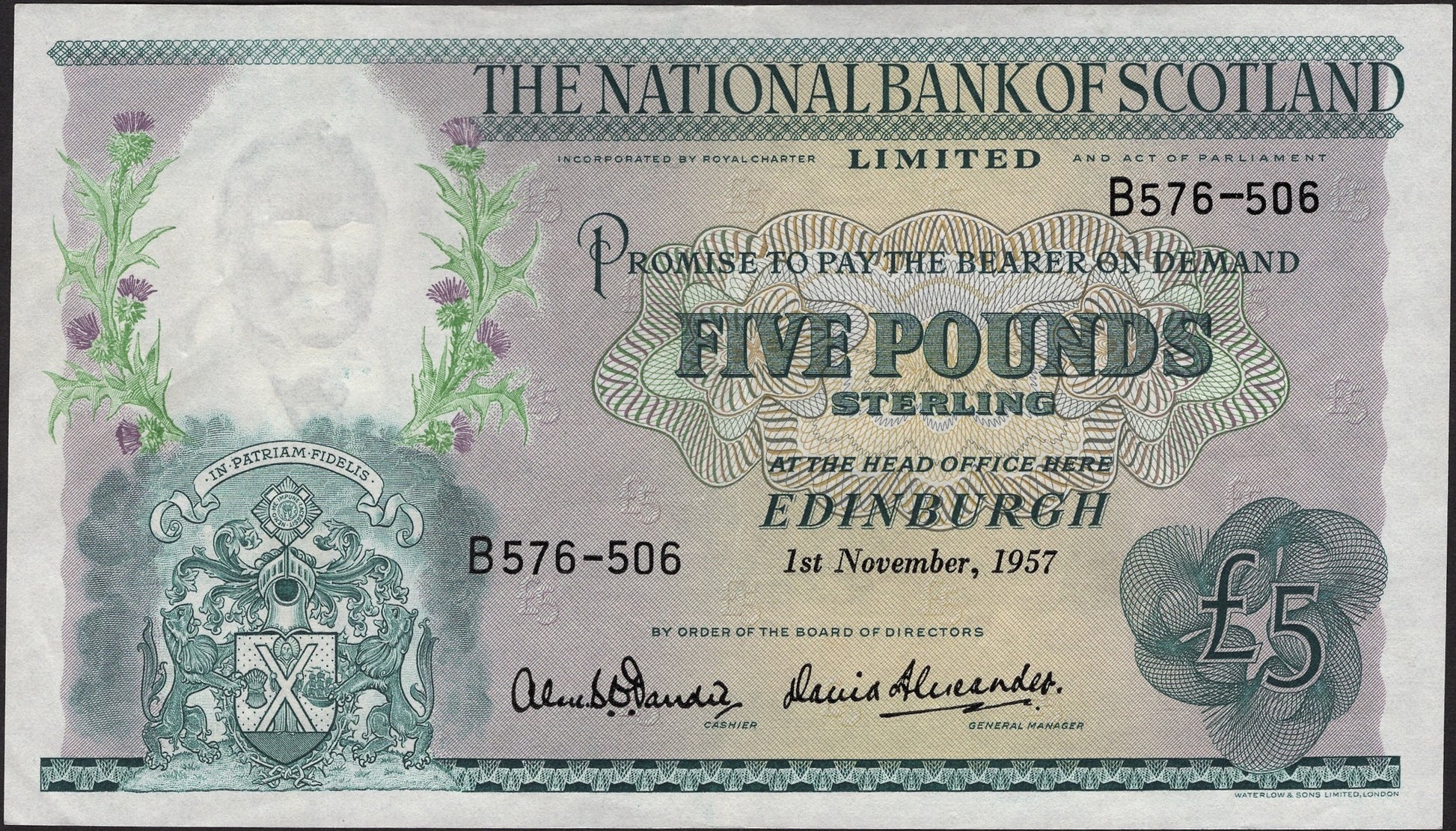 SCOTLAND P.262 SC513 1957 National Bank of Scotland £5 GEF